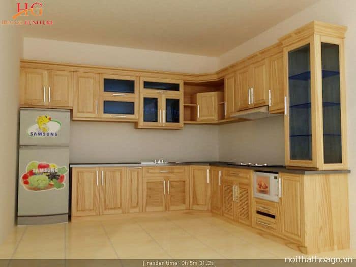 Mẫu tủ bếp gỗ đẹp làm bằng gỗ sồi Nga tự nhiên màu vàng nhạt hình chữ L.